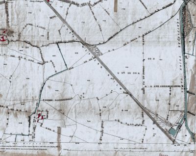 Diagram of the Rednal boneyard in 1861 showing the sidings coming down from the Great Western Railway with a small building at the junction of the "cut" and the Montgomery canal.It would also appear to show a possible tramway leading alongside the "cut". The two rail lines alongside the "cut " are not shown on the 1875 OS map shown below nor are the buildings. It is interesting to note that the factory later became a superphosphates factory.