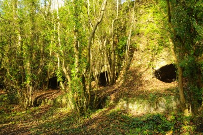 Photo of part of the bank of 8 lime kilns alongside the long incline running up from behind the Lime Kiln pub.